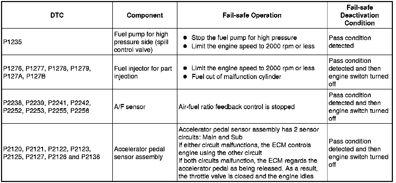 If any of the following DTCs are set, the ECM enters fail-safe mode to allow the vehicle to be driven temporarily.