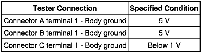 With each connector still connected, measure the voltage between body ground and the following terminals (in this order): 1) terminal 1 of connector A, 2) terminal 1 of connector B, and 3) terminal 1 of connector C.