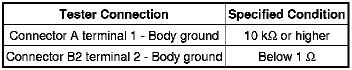 * If the results match the values specified above, an open circuit exists between terminal 1 of connector B2 and terminal 1 of connector C.