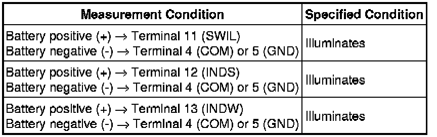 (b) Apply battery voltage between the terminals of the switch, and check the illumination condition of the switch.