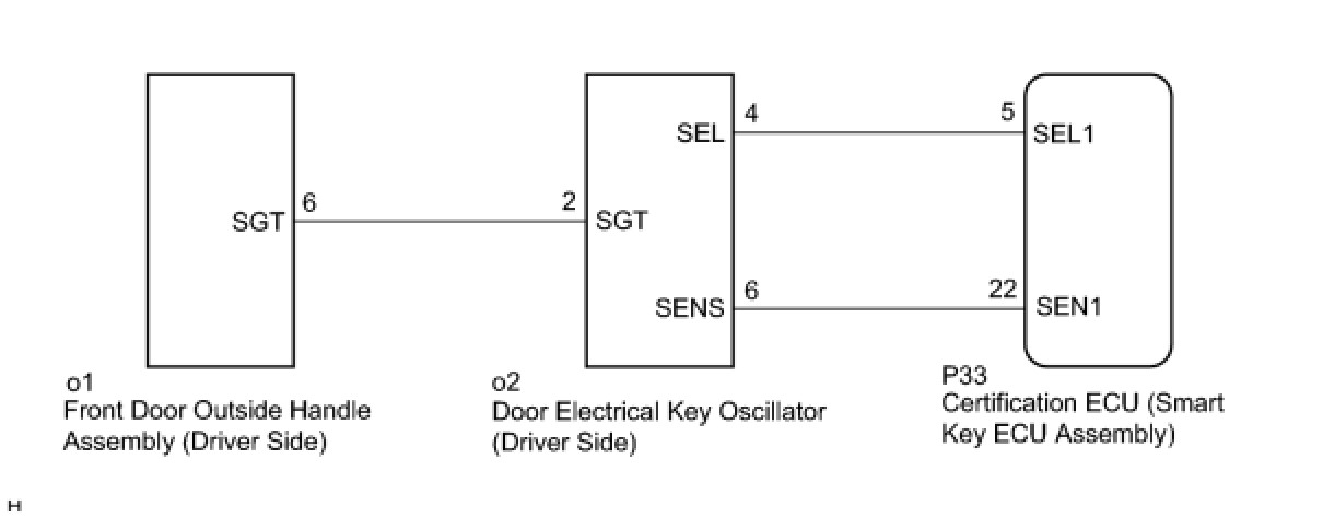 If the driver door entry unlock function does not operate but the entry lock function operates, the communication line between the vehicle and electrical key transmitter is normal. Any of the following components may have a malfunction: 1) touch sensor circuit certification ECU (smart key ECU assembly); 2) front door outside handle assembly (driver side); or 3) door electrical key oscillator (driver side).