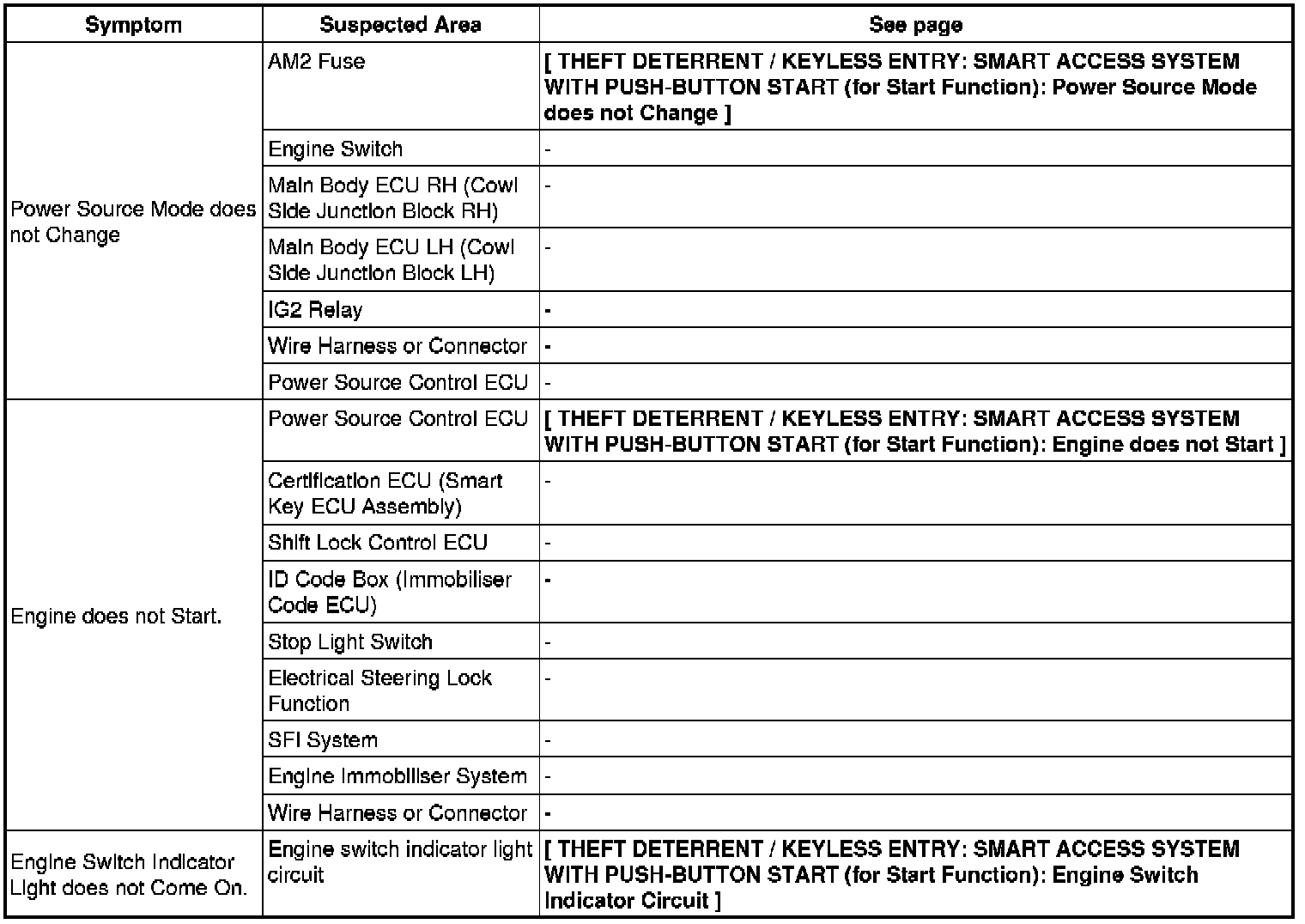 THEFT DETERRENT / KEYLESS ENTRY: SMART ACCESS SYSTEM WITH PUSH-BUTTON START (for Start Function): PROBLEM SYMPTOMS TABLE