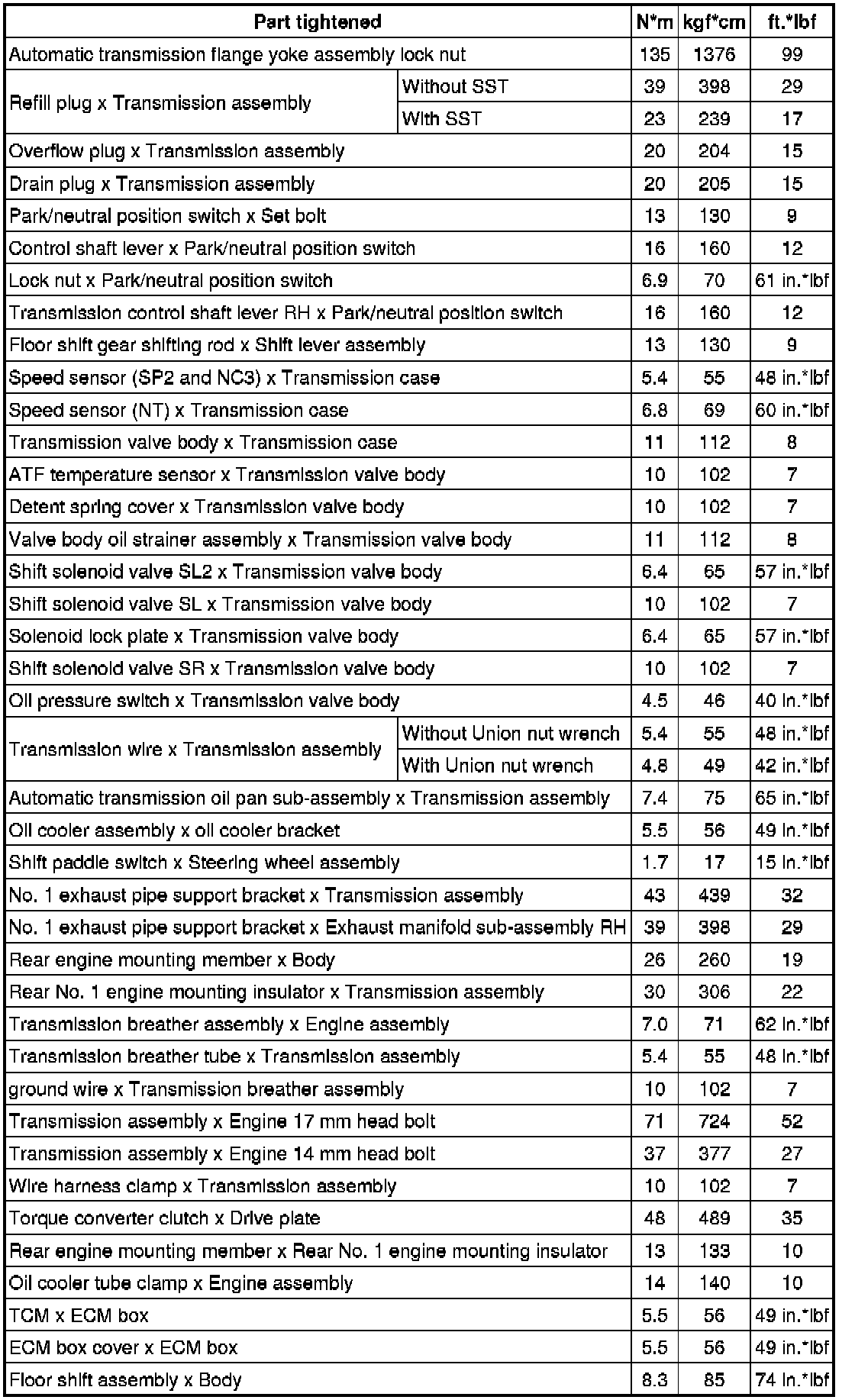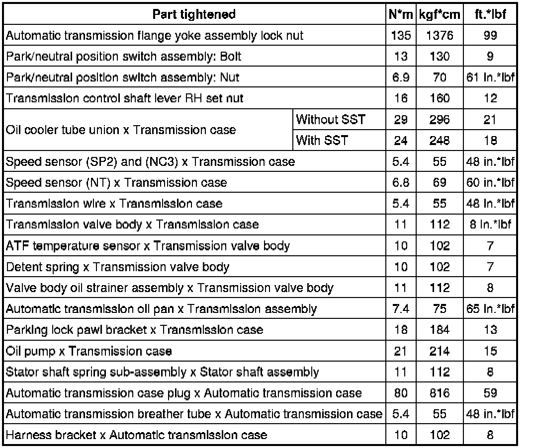 SPECIFICATIONS: AA80E AUTOMATIC TRANSMISSION / TRANSAXLE: TORQUE SPECIFICATIONS