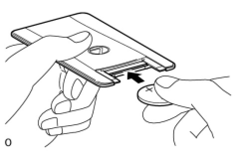 (c) Push in and install the transmitter battery (lithium battery (CR2412)) while being careful of the following: 1) the battery's positive (+) and negative (-) terminals; and 2) being sure to insert the battery between the 2 terminals and deep into the card, in the direction of the arrow.