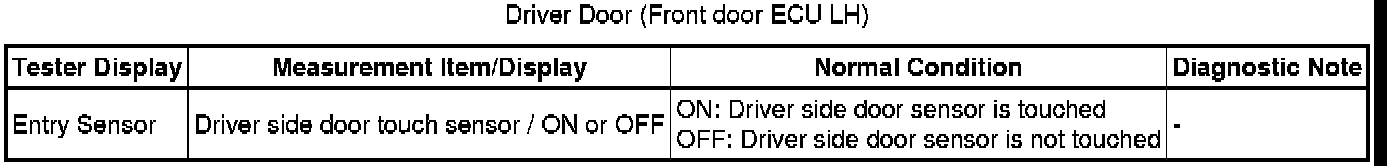 If the driver door entry unlock function does not operate but the entry lock operation operates, the communication line between the vehicle and electrical key transmitter is normal. Either of the following may have occurred: 1) the door outside handle touch sensor is malfunctioning; or 2) the front door ECU LH receives the door outside handle touch sensor ON signal, but is unable to send the signal to the certification ECU through CAN communication.