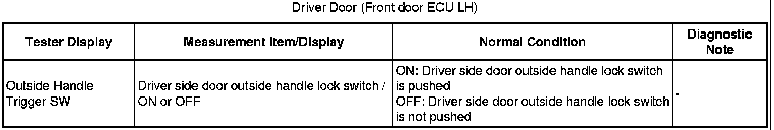 If the driver door entry lock function does not operate but the entry unlock operation operates, the communication line between the vehicle and electrical key transmitter is normal. Either of the following may have occurred: 1) the entry lock switch is malfunctioning; or 2) the front door ECU LH receives the entry lock switch ON signal, but is unable to send the signal to the certification ECU through CAN communication.
