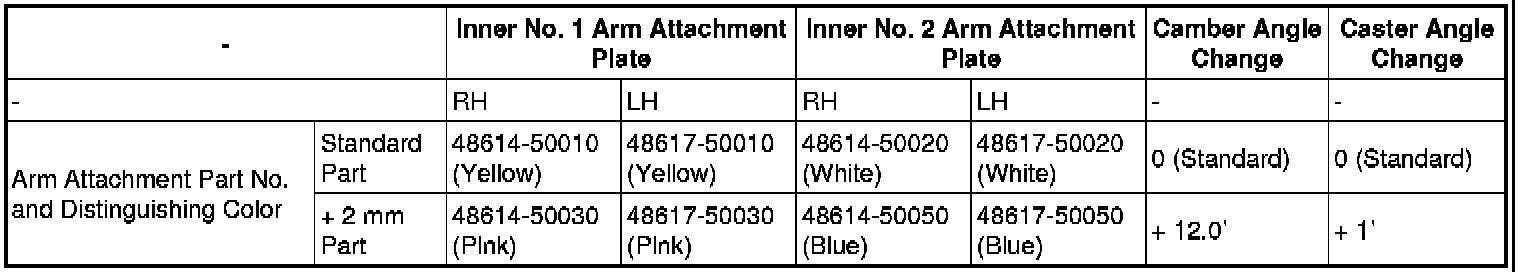 (a) If the right and left camber values are not within the specified value even though the camber and caster have been adjusted with the toe adjusting cam and camber adjusting cam, replace the inner No. 1 and No. 2 arm attachment plates and perform the camber adjustment.