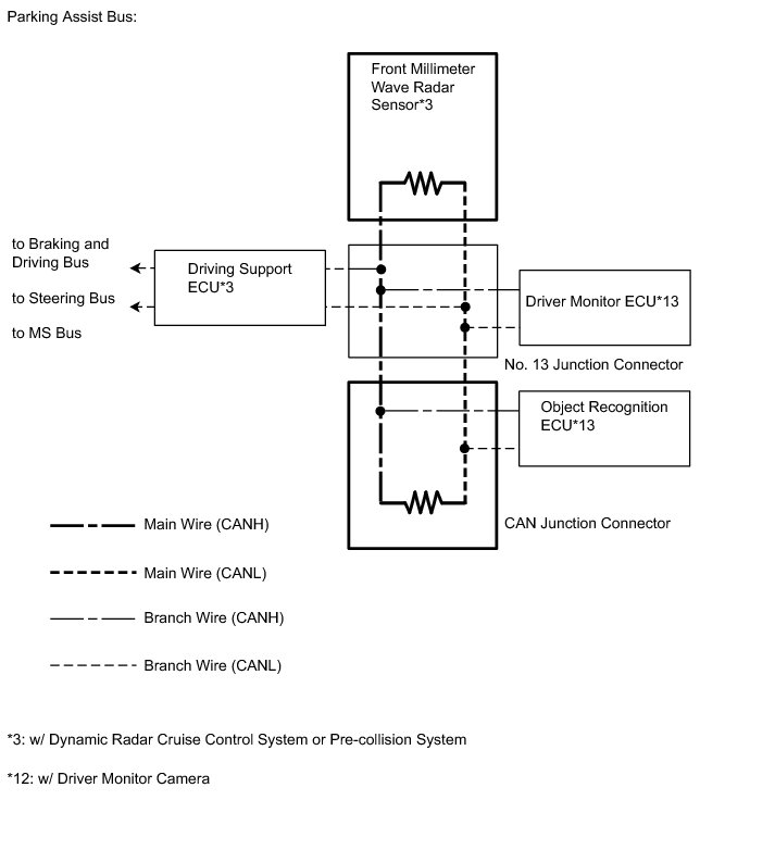 If the vehicle is not equipped with a radar cruise control system or pre-collision system, the parking assist bus does not exist.