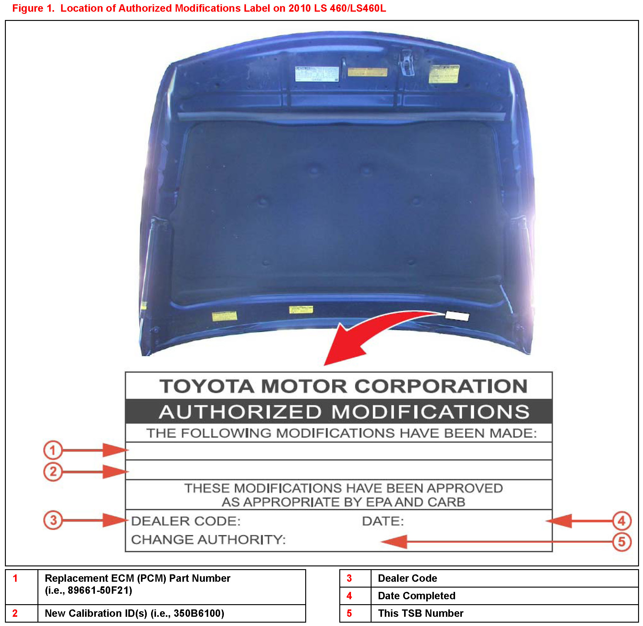2. Check for the Authorized Modifications Label affixed to the vehicle in the location shown in Figure 1. Confirm if the ECM (PCM) calibration has been updated. If the calibration 10 listed is NOT the latest ECM (PCM) calibration - go to step 3.