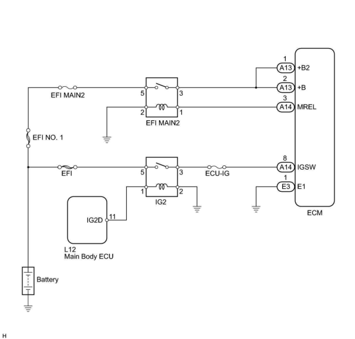 When the engine switch is turned on (IG), voltage from the ECM's MREL terminal is applied to the EFI relay (EFI MAIN2). This causes the contacts of the EFI relay (EFI MAIN2) to close, which supplies power to terminal +B and +B2 of the ECM.