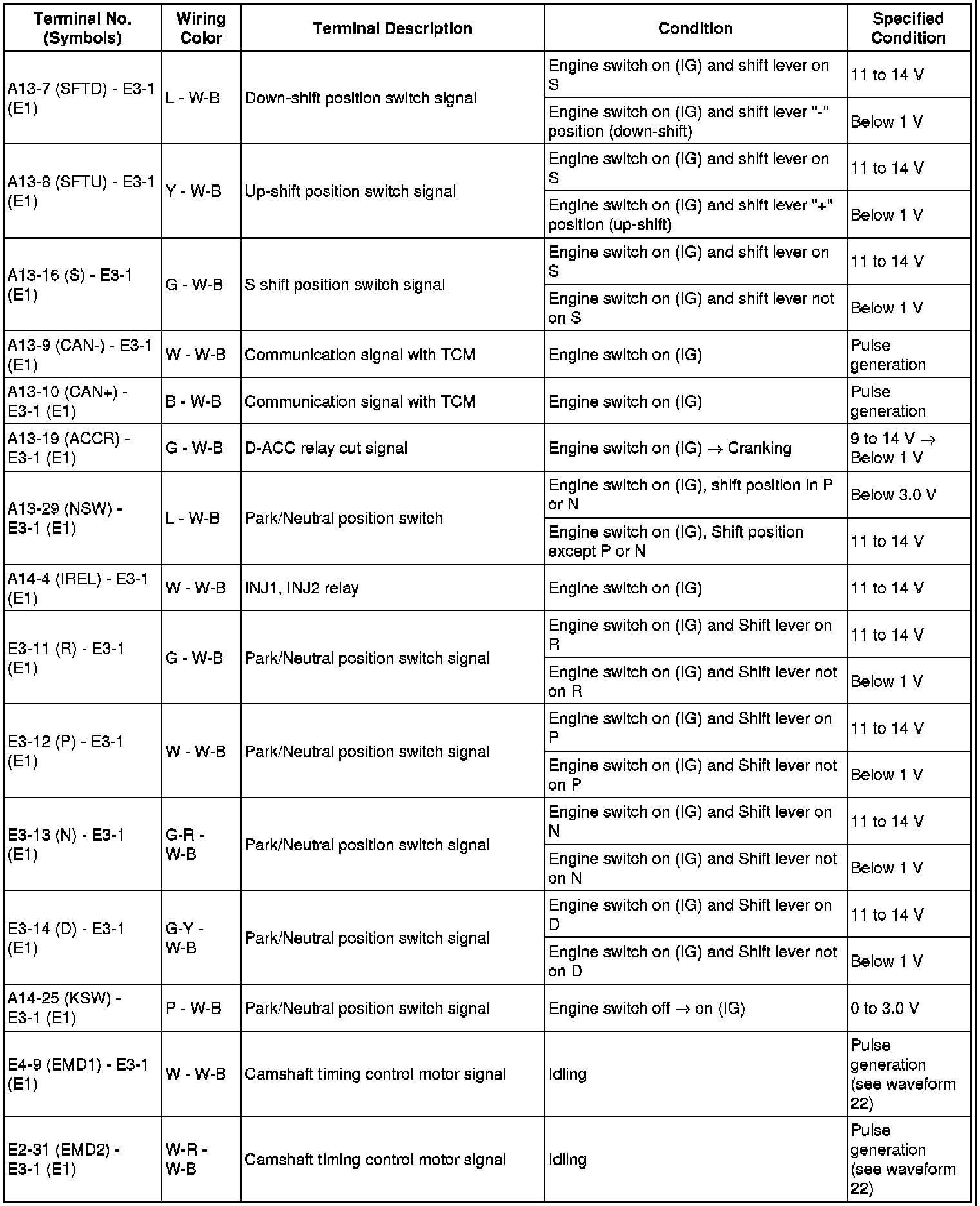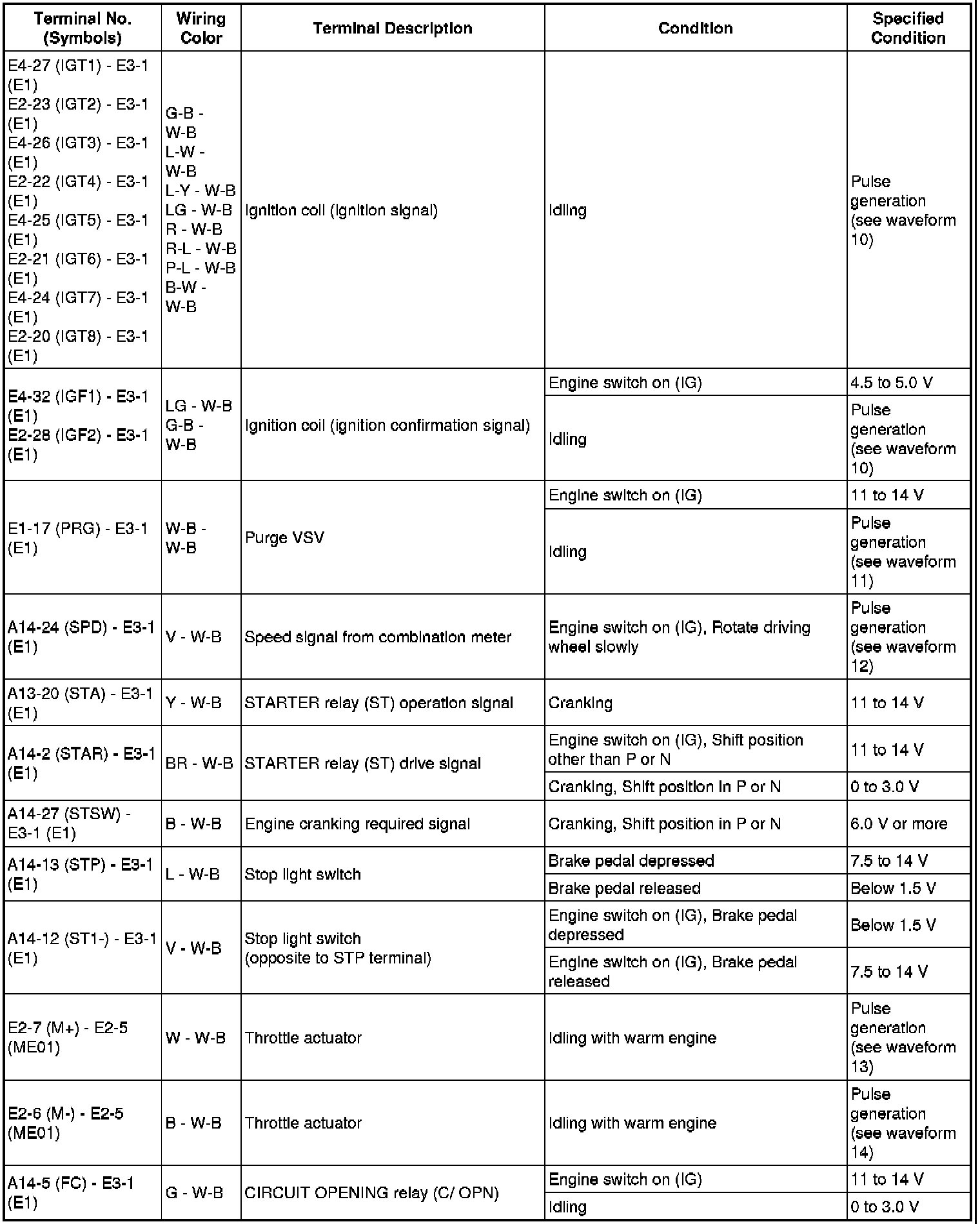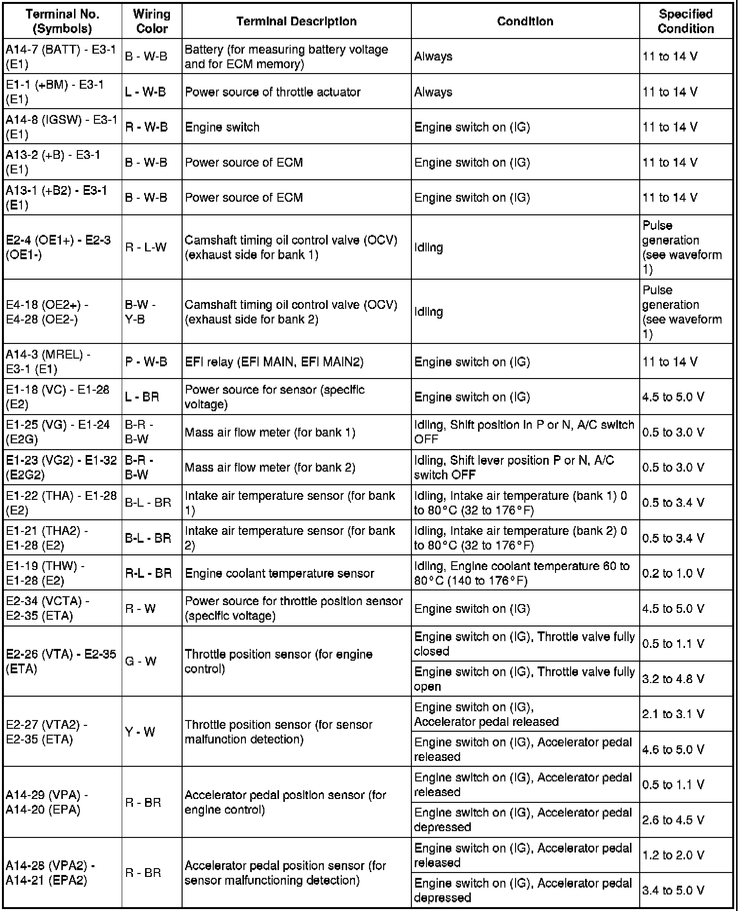 The standard normal voltage between each pair of the ECM terminals is shown in the table below. The appropriate conditions for checking each pair of the terminals are also indicated. The result of checks should be compared with the standard normal voltage for that pair of terminals, displayed in the Specified Condition column. The illustration above can be used as a reference to identify the ECM terminal locations.