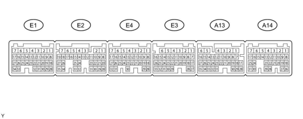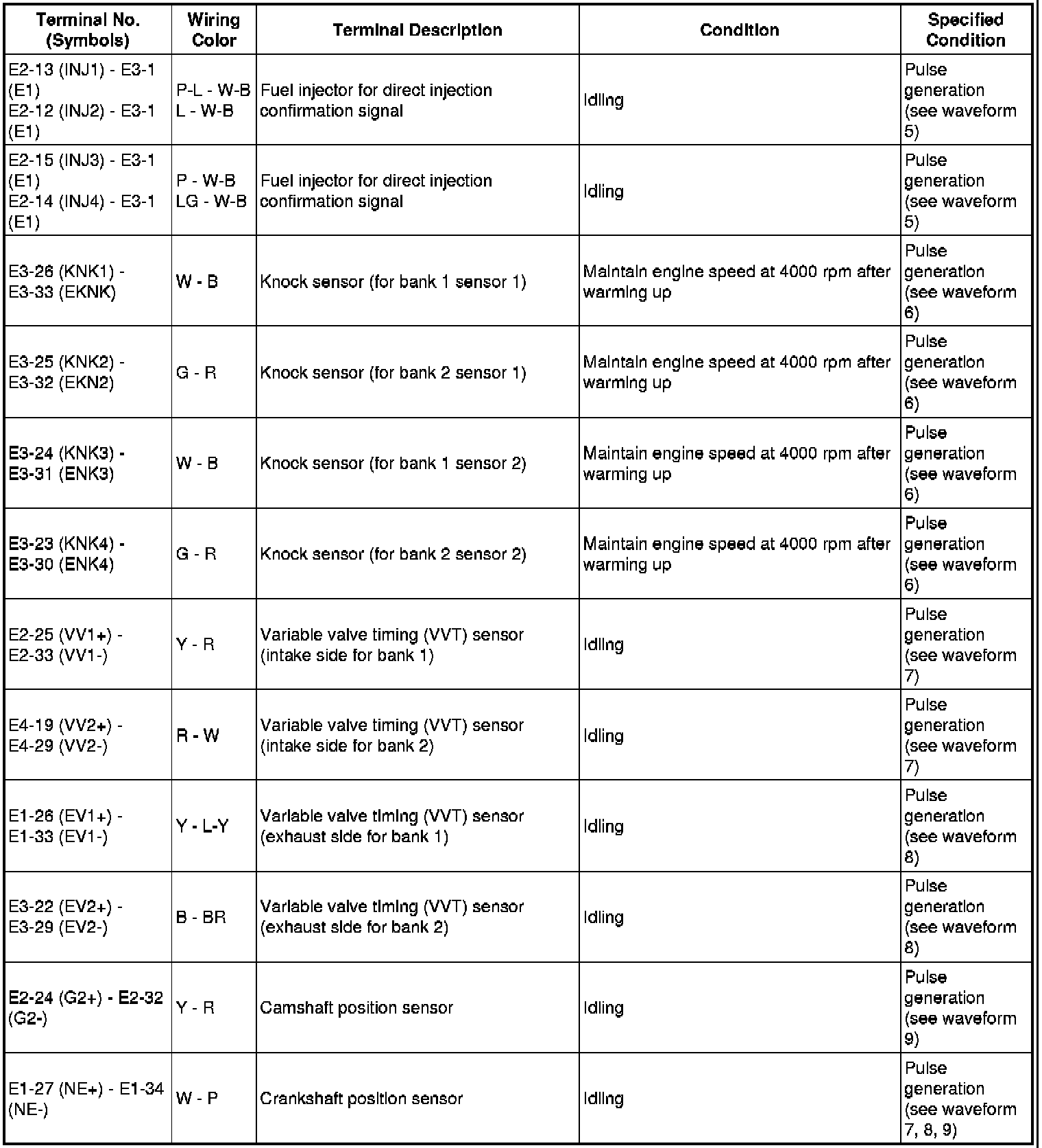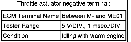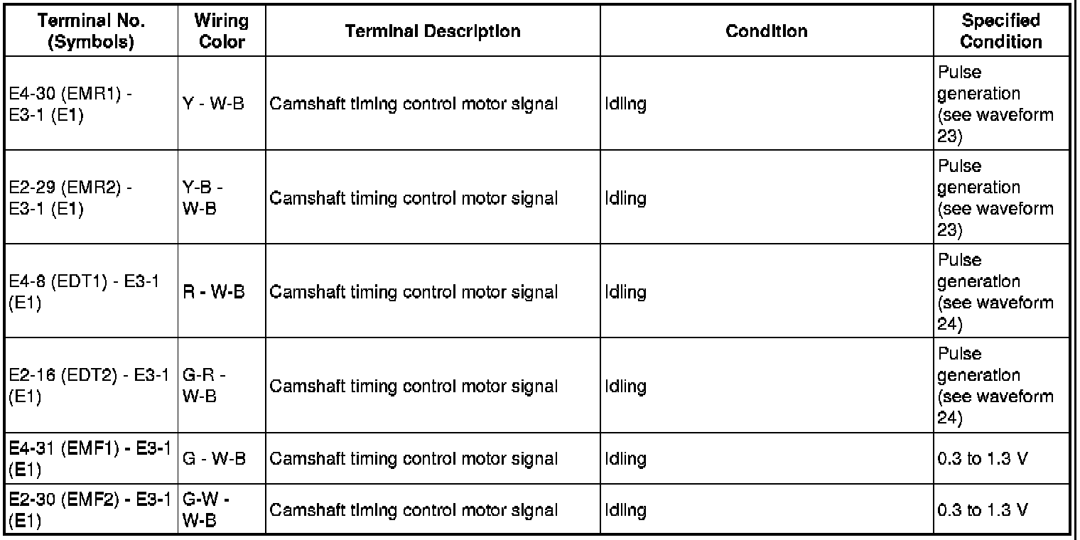 The standard normal voltage between each pair of the ECM terminals is shown in the table below. The appropriate conditions for checking each pair of the terminals are also indicated. The result of checks should be compared with the standard normal voltage for that pair of terminals, displayed in the Specified Condition column. The illustration above can be used as a reference to identify the ECM terminal locations.