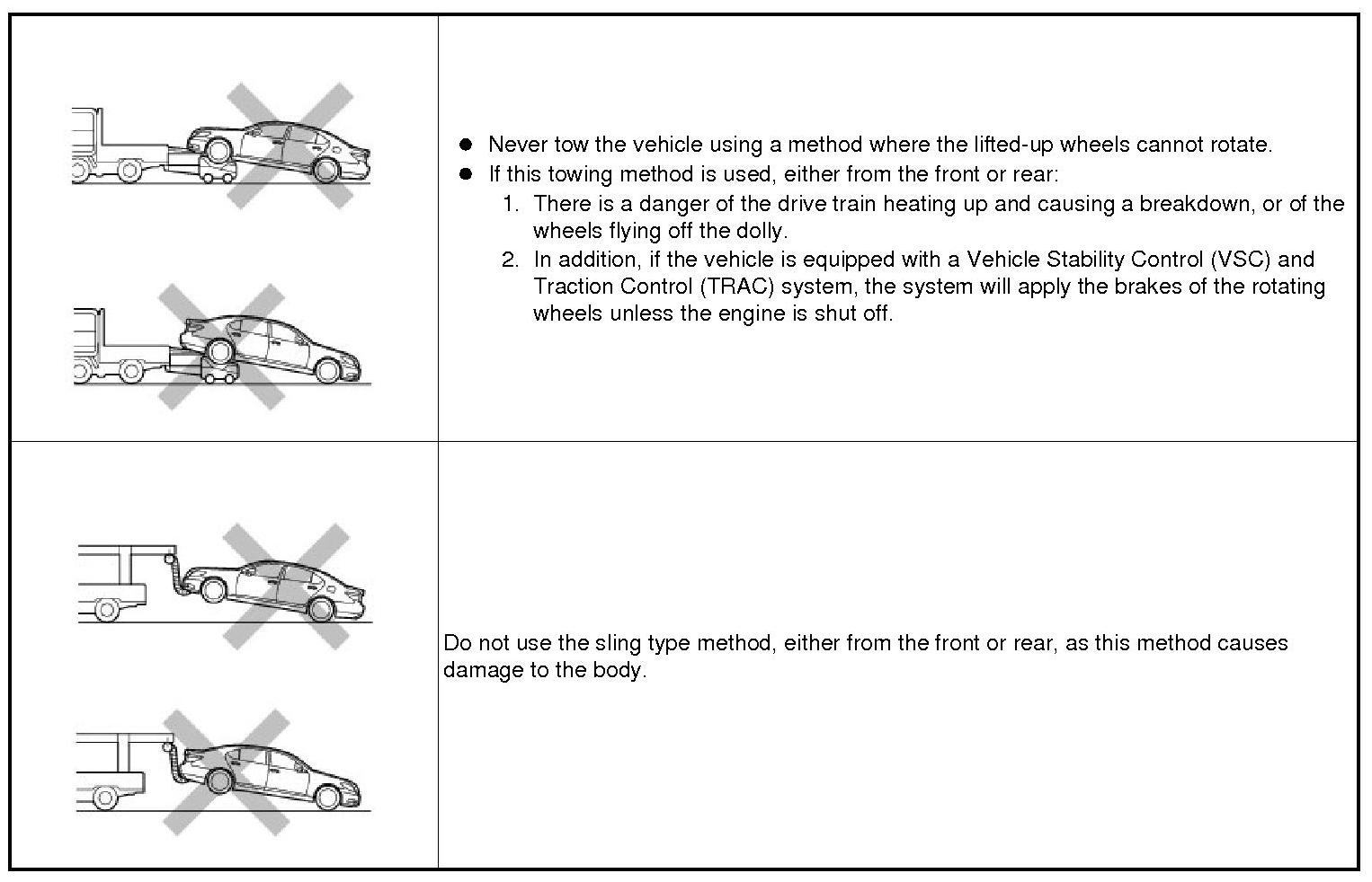 (2) For example, the towing methods shown below are dangerous or may damage the vehicle, so do not use them.