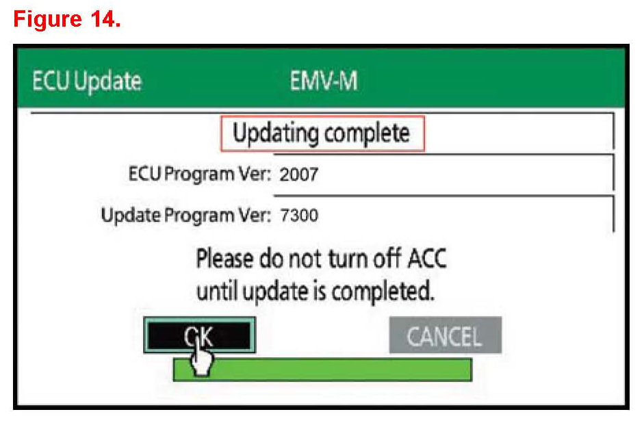 10. After about 1 minute, if the update was successful the display will indicate "Updating complete" at the top of the screen. Select OK to continue.
