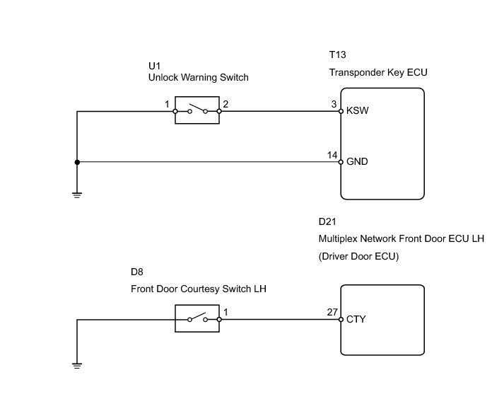 The transponder key ECU uses the unlock warning switch to detect when the key is in the ignition key cylinder, and transmits the detection as a signal to the theft warning ECU. When the door is locked with the ignition switch OFF and the key in the ignition key cylinder, the theft warning ECU transmits the LOCK signal. Then the UNLOCK signal is sent to the multiplex network door ECU front LH and RH. After those operations, the multiplex network front door ECU LH and RH drive the door lock motor.
