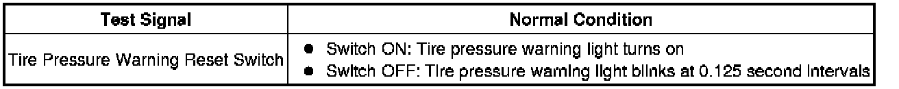 Every time the test mode DTC erasure conditions are satisfied, the tire pressure warning light comes on for 1 second. Then, the tire pressure warning light blinks at 0.125 second intervals.
