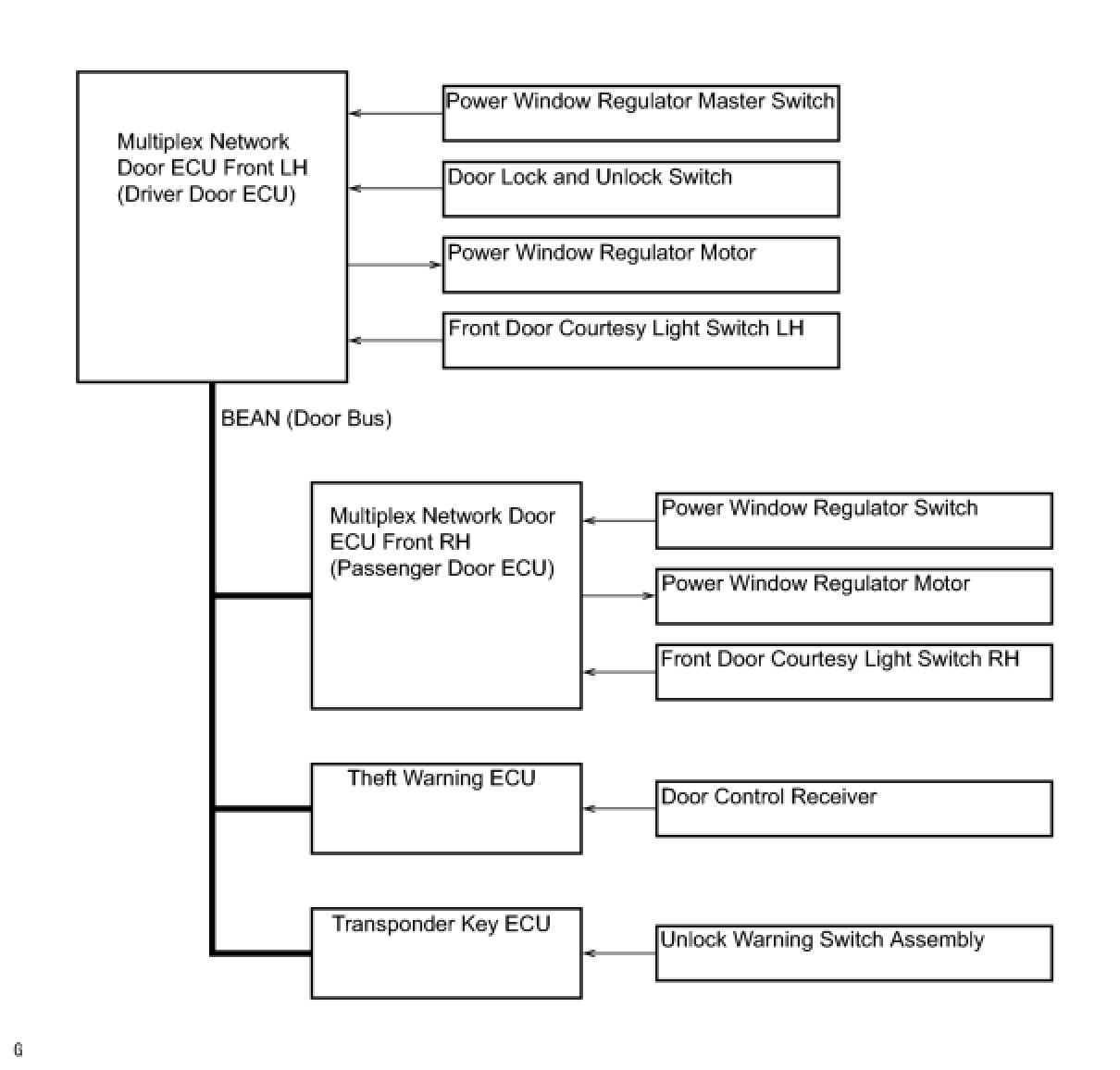 The main controls of this system are: the power window regulator master switch, which is built into the driver side door, and the power regulator switch, which is built into the passenger side door. Pressing the regulator switch on the master switch transmits a remote UP / DOWN signal to the multiplex network door ECU front RH (passenger door ECU) via the BEAN line.