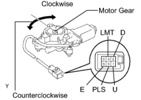 * Be sure not to apply battery voltage to terminals 3 (PLS), 4 (LMT) and 5 (E) of the power window regulator motor RH connector, because it might damage the pulse sensor and the limit switch.