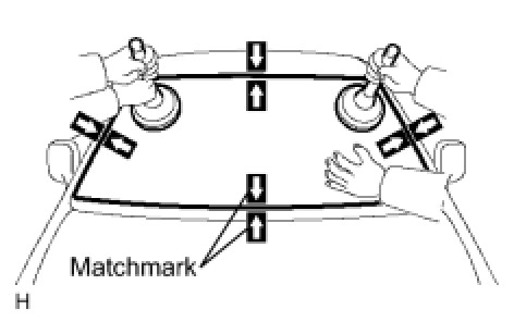 (1) Using a suction cup, position the glass so that the matchmarks are aligned. Press it in gently along the rim.