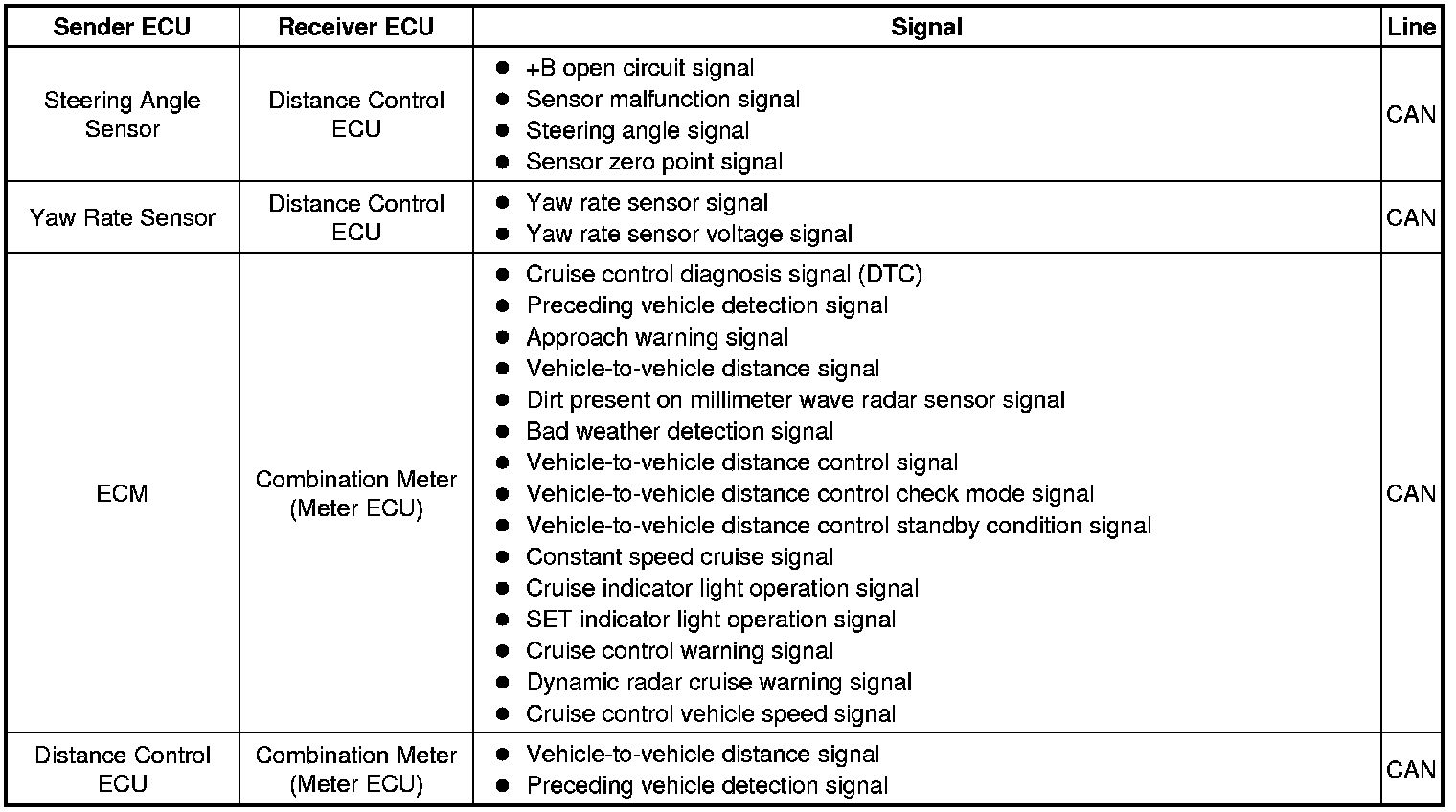 (e) In vehicle-to-vehicle distance control mode, the dynamic radar cruise control system receives signals from the yaw rate and acceleration sensor and the steering angle sensor. Based on these signals, it then estimates curve radius and compensates for information on the preceding vehicle while turning. It can also compensate for the brake control when approaching another vehicle.