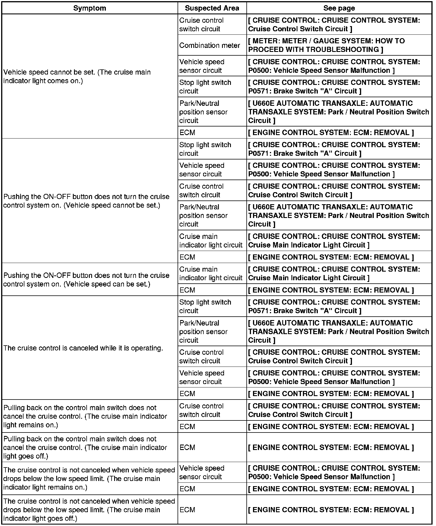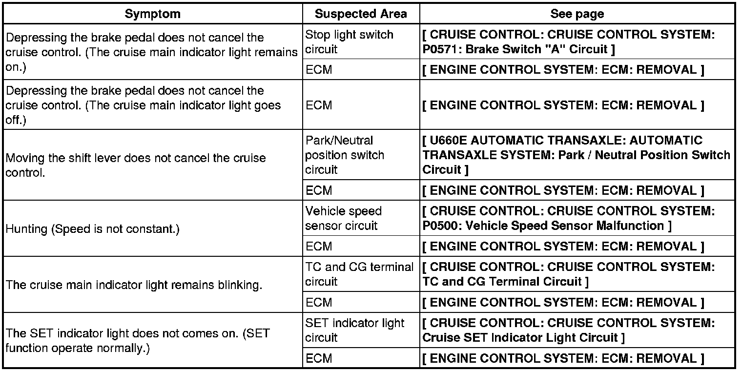 CRUISE CONTROL: CRUISE CONTROL SYSTEM: PROBLEM SYMPTOMS TABLE
