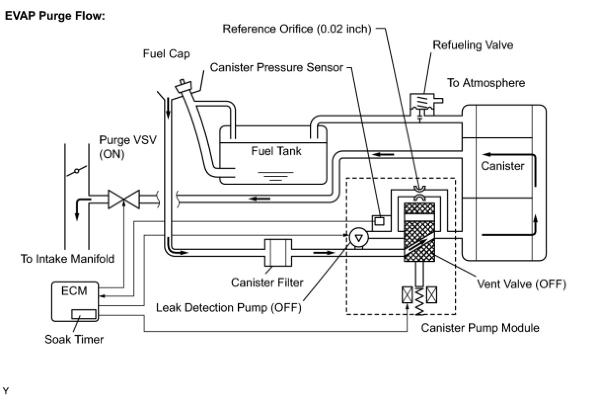 * While the engine is running and the purge VSV (Vacuum Switching Valve) is ON (open), the ECM monitors the purge flow by measuring the EVAP pressure change. If negative pressure is not created, the ECM begins the 2nd monitor.