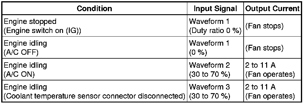 * If the output current is abnormal even when the input signal is normal, there is a malfunction in the cooling fan ECU (RFC) or motor.