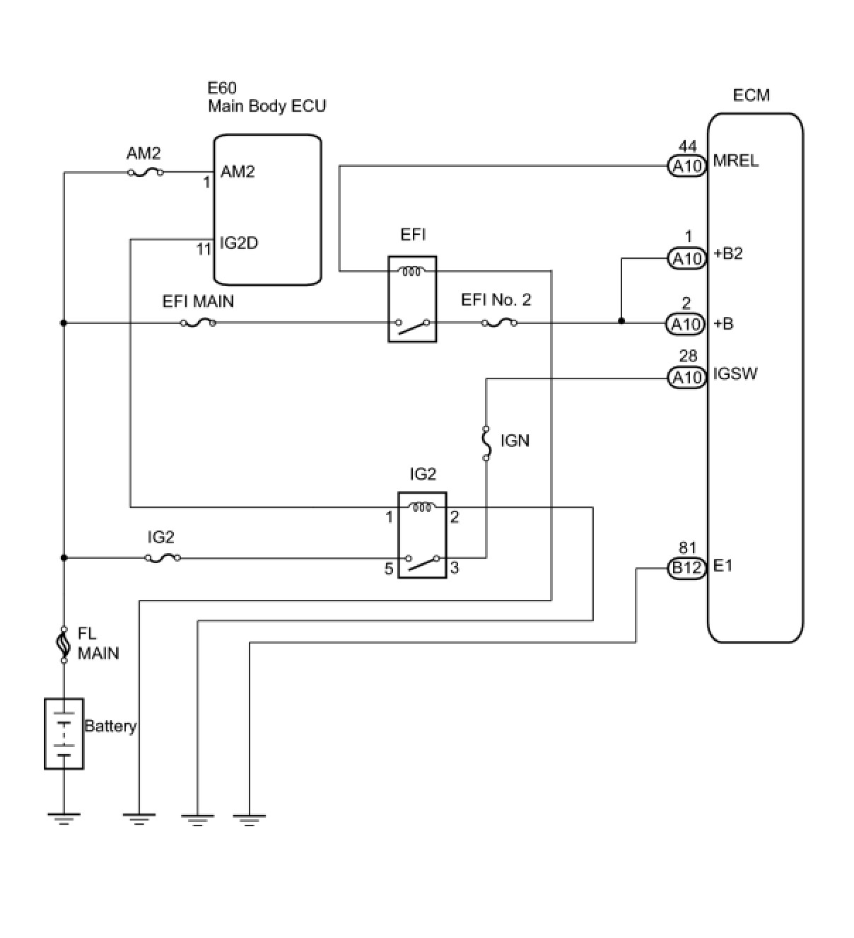 When the engine switch is turned on (IG), voltage from the ECM's MREL terminal applies to the engine room junction block (EFI relay). This causes the contacts of the engine room junction block (EFI relay) to close, which supplies power to terminal +B or +B2 of the ECM.