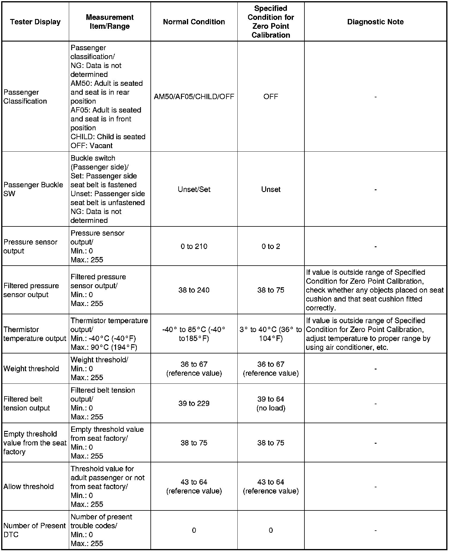 1. DATA LIST FOR OCCUPANT CLASSIFICATION ECU