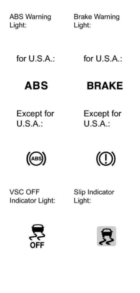 (b) When the engine switch is turned on (IG), check that the ABS warning, brake warning, VSC OFF indicator and slip indicator lights will come on for approximately 3 seconds.