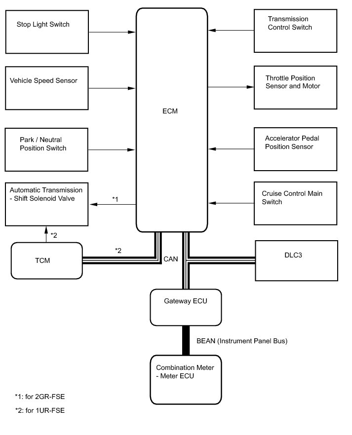 The ECM cancels the cruise control system when the shift lever is moved to any position except D or S (8th, 7th, 6th, 5th, 4th gear), and the ECM receives the PNP switch signal. (for 1UR-FSE)
