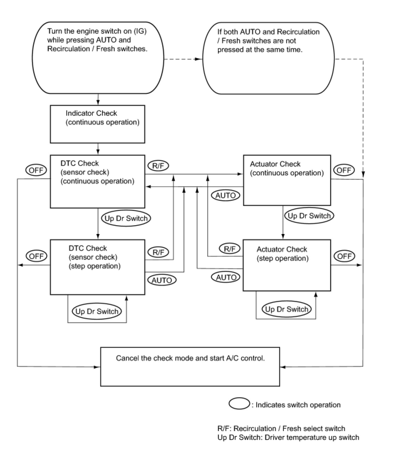 By operating each of the A/C control switches as shown in the diagram below, it is possible to enter the diagnostic check mode.