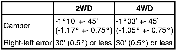 If the measured value is not within the specified range, inspect the suspension parts for damage and wear. Replace parts as necessary because camber cannot be properly adjusted with any damaged or worn parts.