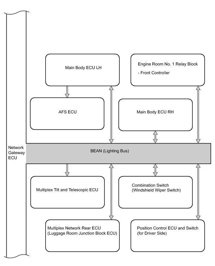 (1) The BEAN uses a ring and bus style of network to connect ECUs. This style of communication method is called a daisy chain. In a daisy chain, communication can be maintained even if the network has an open circuit.