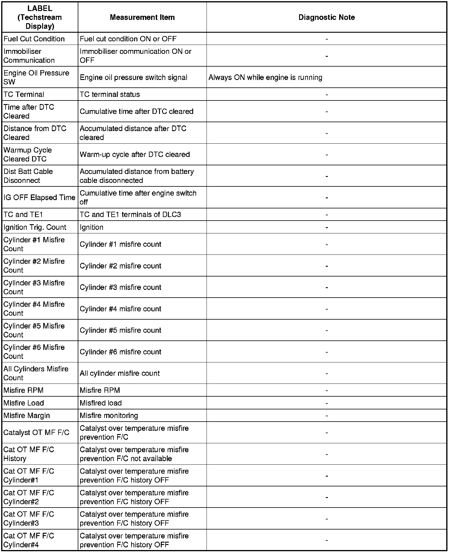 The ECM records engine conditions in the form of freeze frame data every 0.5 seconds. Using the Techstream, five separate sets of freeze frame data, including the data values at the time when the DTC was set, can be checked.