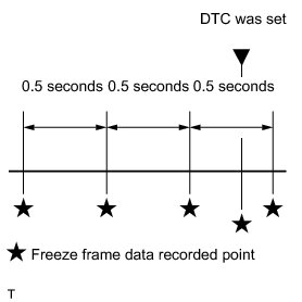 The ECM records engine conditions in the form of freeze frame data every 0.5 seconds. Using the Techstream, five separate sets of freeze frame data, including the data values at the time when the DTC was set, can be checked.