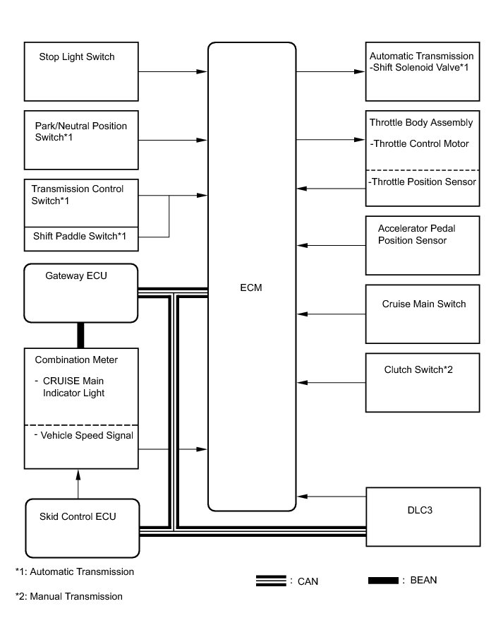 The ECM cancels the cruise control system when 3rd, 2nd, or 1st range is selected using the shift paddle switch (for Automatic Transmission).