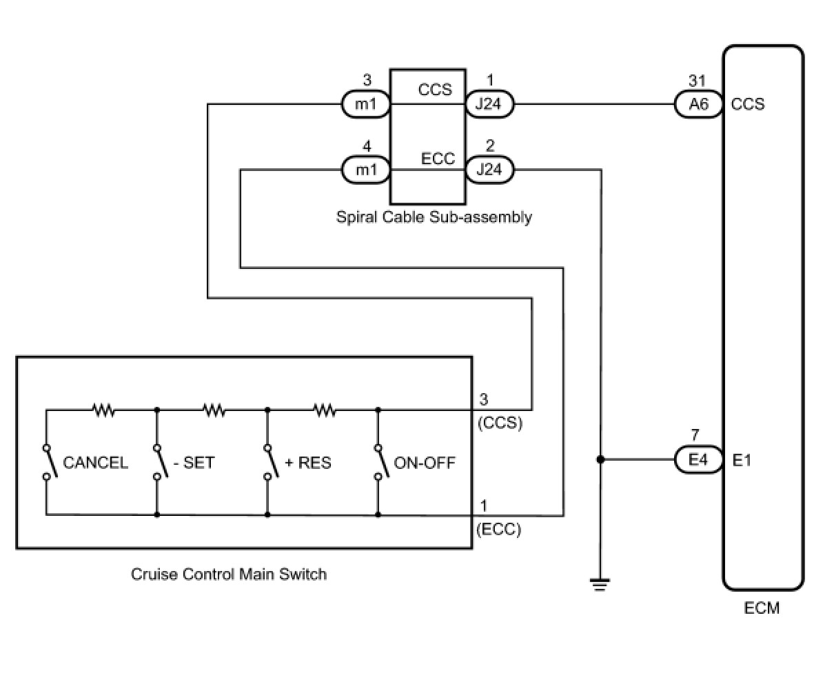The cruise control main switch operates 7 functions: SET, - (COAST), TAP-DOWN, RES (RESUME), + (ACCEL), TAP-UP, and CANCEL. The SET, TAP-DOWN, and - (COAST) functions, and the RES (RESUME), TAP-UP, and + (ACCEL) functions are operated with the same switch. The cruise control main switch is an automatic return type switch which turns on only while operating it in the direction of each arrow and turns off after releasing it. The internal contact point of the cruise control main switch is turned on with the switch operation. Then the ECM reads the voltage value that has been changed by the switch operation to control SET, - (COAST), RES (RESUME), + (ACCEL), and CANCEL.