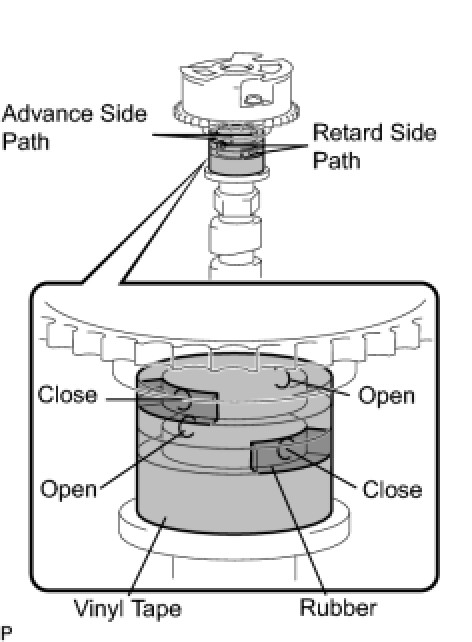 (5) When the camshaft timing exhaust gear moves to the most retarded position, release the air pressure from the advance side path, and then release the air pressure from the retard side path.