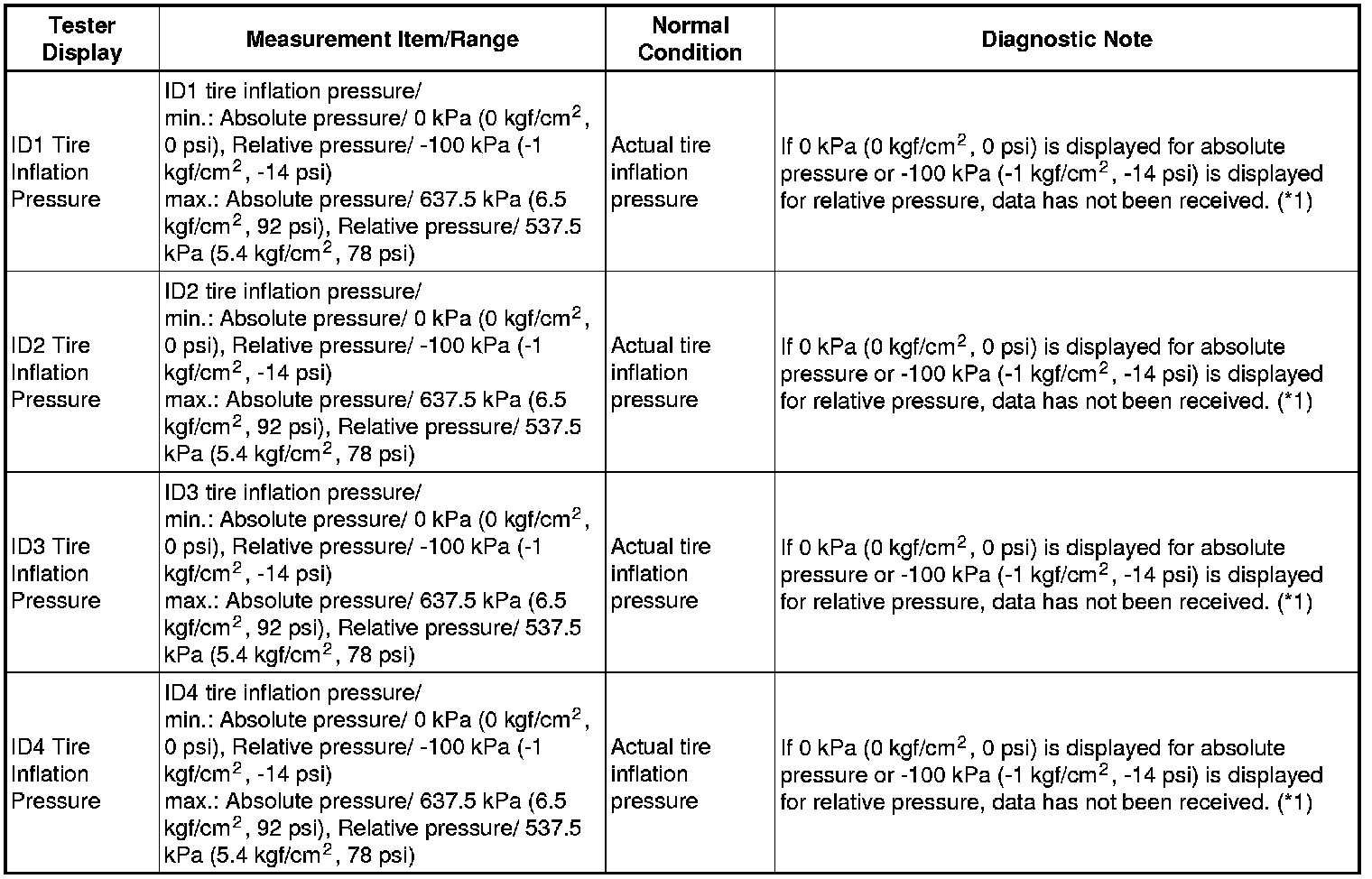 * If the tire pressure values are not displayed after a few minutes, the IDs may be incorrect or the system may have a malfunction.