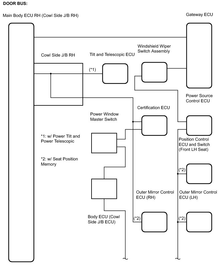 * The CAN uses the multi star style bus connection. The 2 junction connectors are connected with a main bus line. The junction connector extends a sub bus line and enables communication between all the connected ECUs.