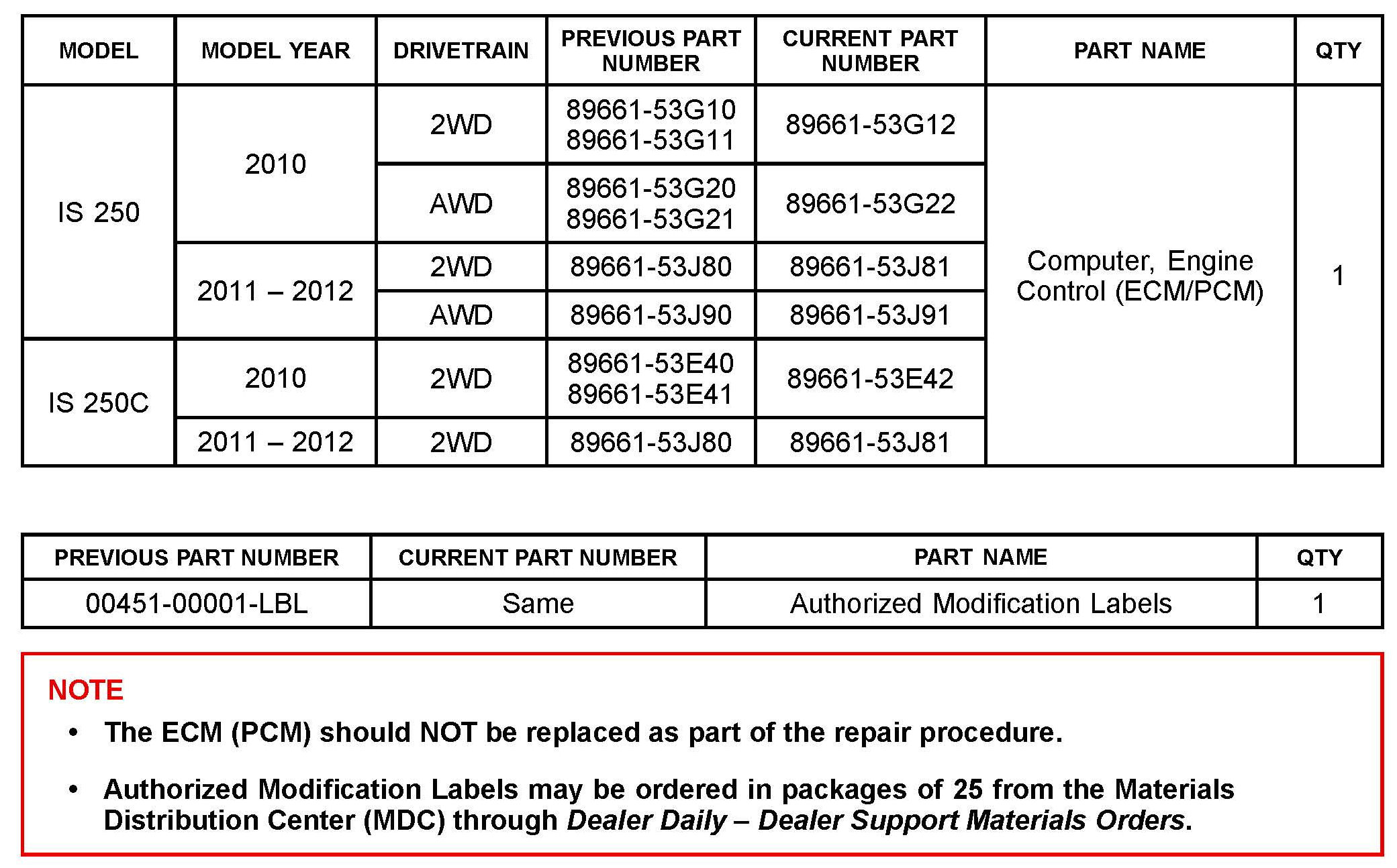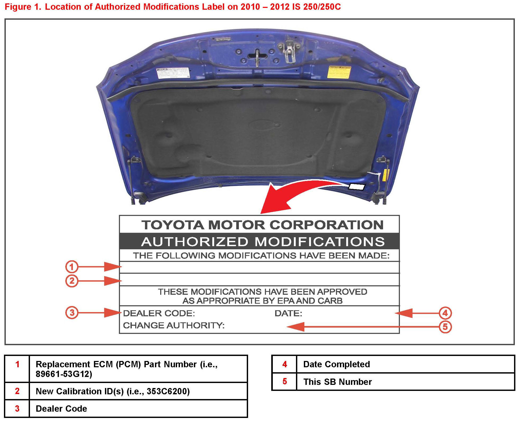 Some 2010 - 2012 model year IS 250 and IS 250C vehicles equipped with automatic transmissions may exhibit a MIL "ON" condition with Diagnostic Trouble Codes (DTCs) P014C, P014D, P014E, or P014F present. The Engine Control Module/ECM (SAE term: Powertrain Control Module/PCM) logic has been modified to reduce the possibility of this condition occurring. Use the following procedure to reprogram the ECM (PCM).