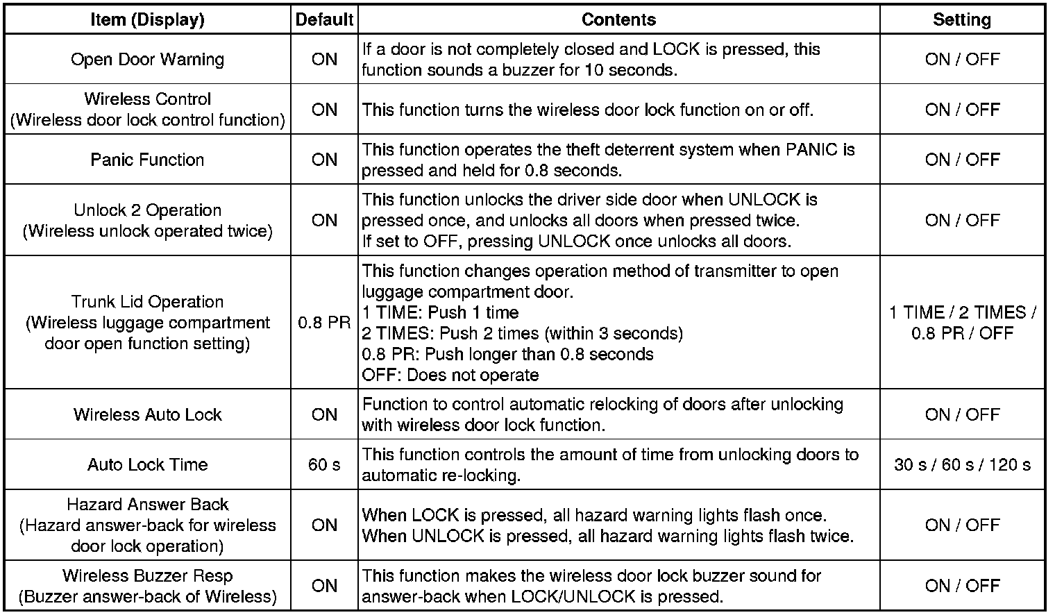 Driver door unlock default setting: