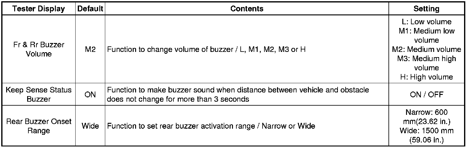 * When either the battery cable or the combination meter connector is disconnected, these buzzers are set on (enabled).