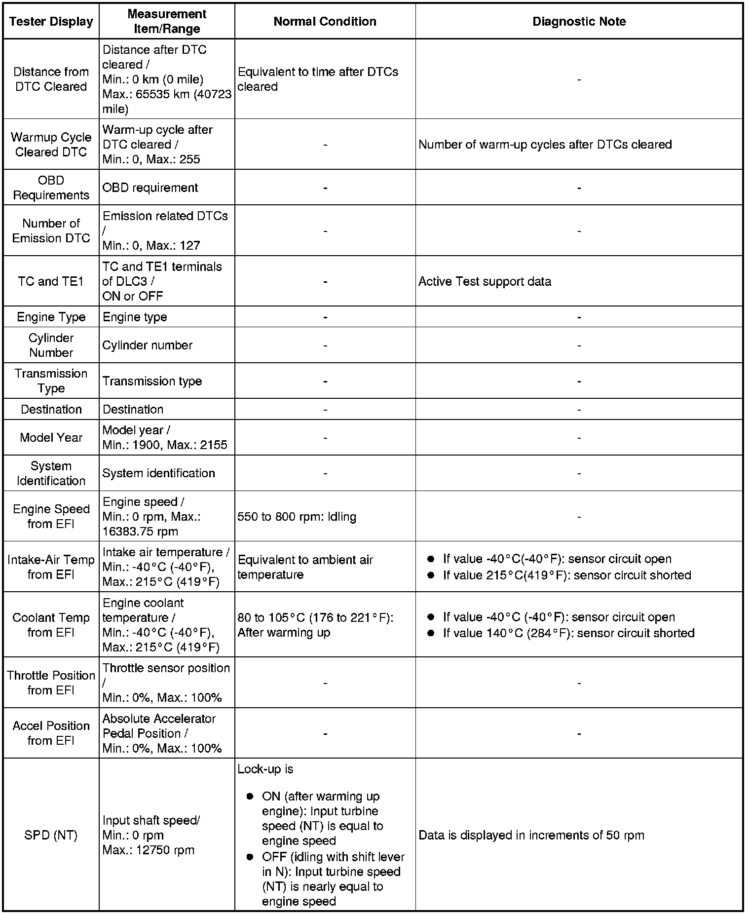 Using the Techstream to read the Data List allows the values or states of switches, sensors, actuators and other items to be read without removing any parts. This non-intrusive inspection can be very useful because intermittent conditions or signals may be discovered before parts or wiring is disturbed. Reading the Data List information early in troubleshooting is one way to save diagnostic time.