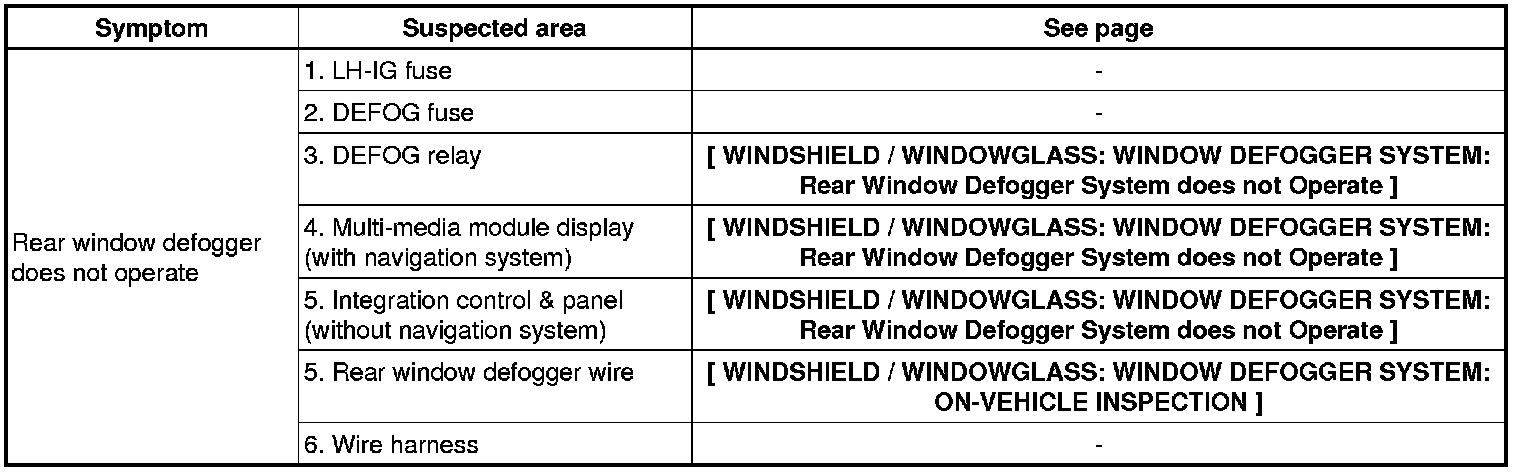 / WINDOWGLASS: WINDOW DEFOGGER SYSTEM: PROBLEM SYMPTOMS TABLE