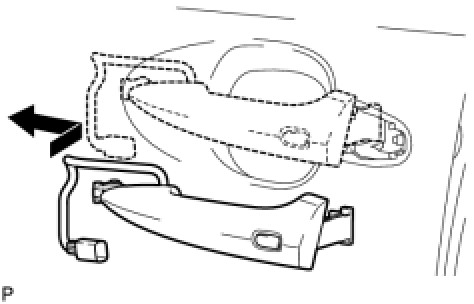 (b) Insert the rear end of the front door outside handle assembly into the front door outside handle frame. Next slide the front door outside handle assembly to the front of the vehicle to install it.