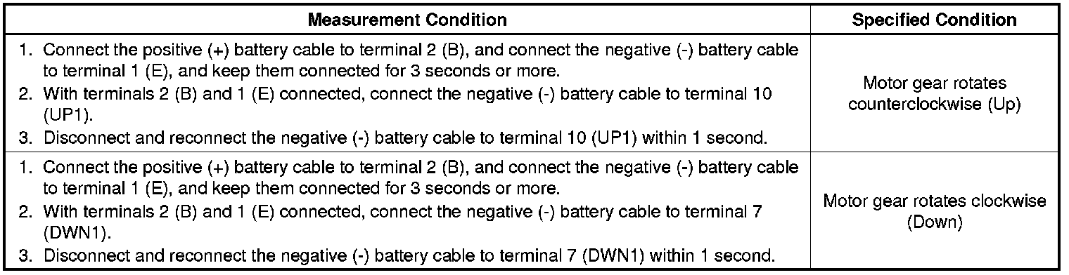 (b) Apply negative (-) battery voltage to connector terminals 1 (E) and 7 (DWN1) or 10 (UP1).