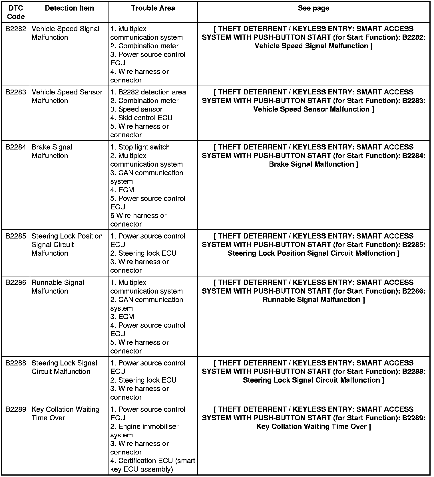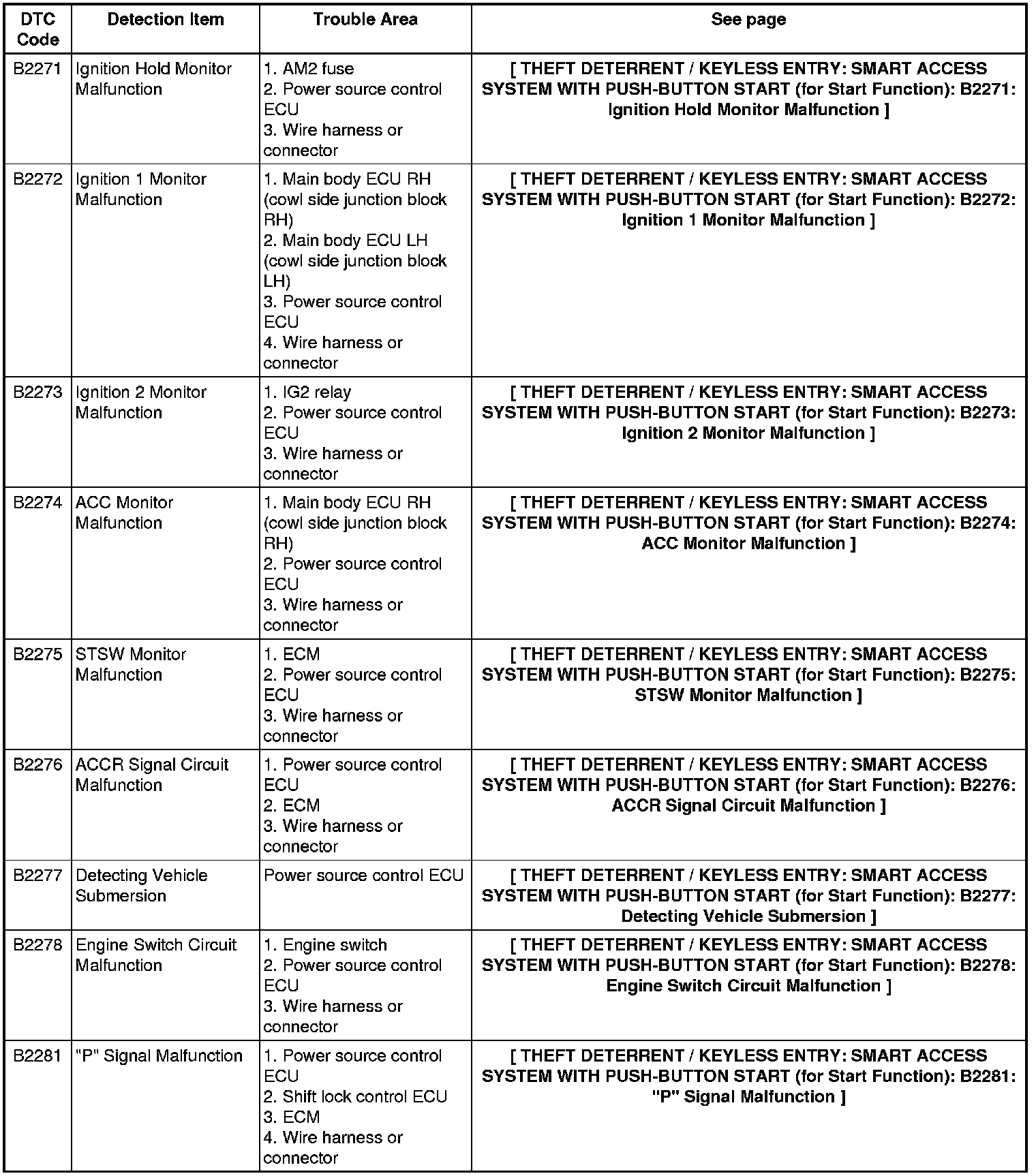 THEFT DETERRENT / KEYLESS ENTRY: SMART ACCESS SYSTEM WITH PUSH-BUTTON START (for Start Function): DIAGNOSTIC TROUBLE CODE CHART