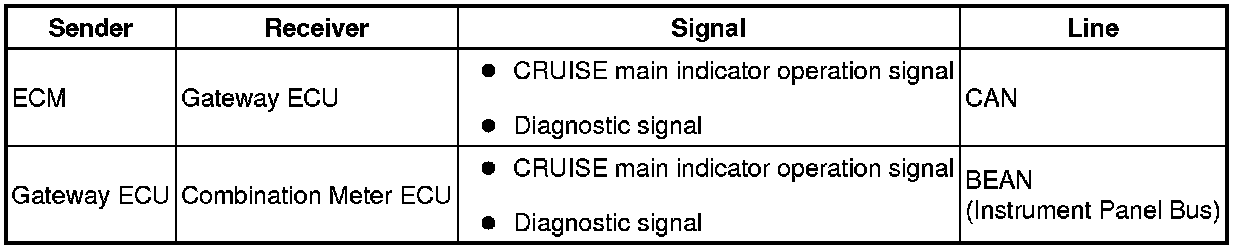 The ECM illuminates the combination meter assembly's CRUISE main indicator light when it receives a cruise control main switch ON signal.